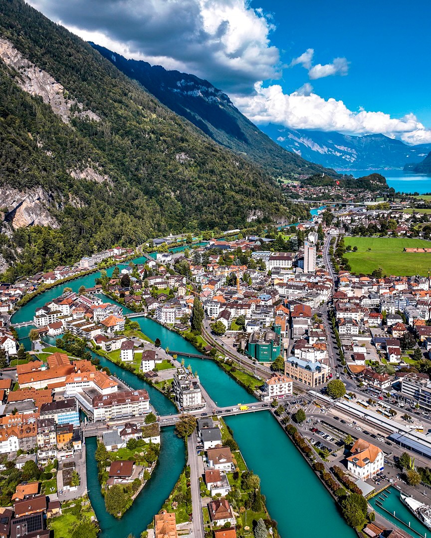 Interlaken sits between Lake Thun and Lake Brienz, acting as the gateway to the Bernese Oberland. You’ll notice the color contrast immediately, Lake Brienz’s turquoise versus Lake Thun’s deep blue, both within 10 minutes of town.