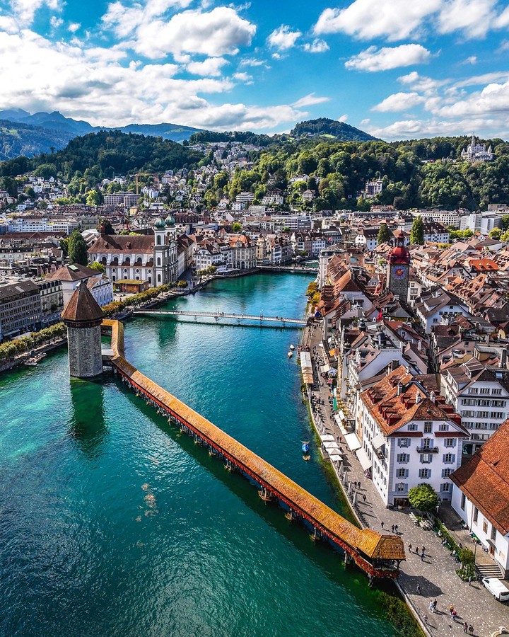 The town of Lucerne sits at its edge, with the iconic Kapellbrücke bridge dating back to the 14th century. From here, you can take a 1-hour boat ride or a full 3-hour cruise across the lake. Mount Pilatus rises nearby to 2,128 meters, reachable via the world’s steepest cogwheel railway with a gradient of 48 percent.