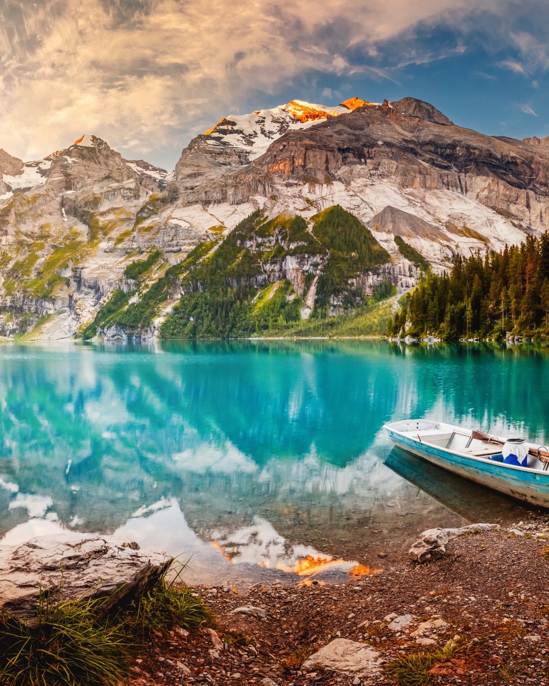 Oeschinen Lake looks almost unreal when you first see it. A deep turquoise lake surrounded by steep cliffs and snow-dusted peaks, sitting at 1,578 meters elevation above Kandersteg.