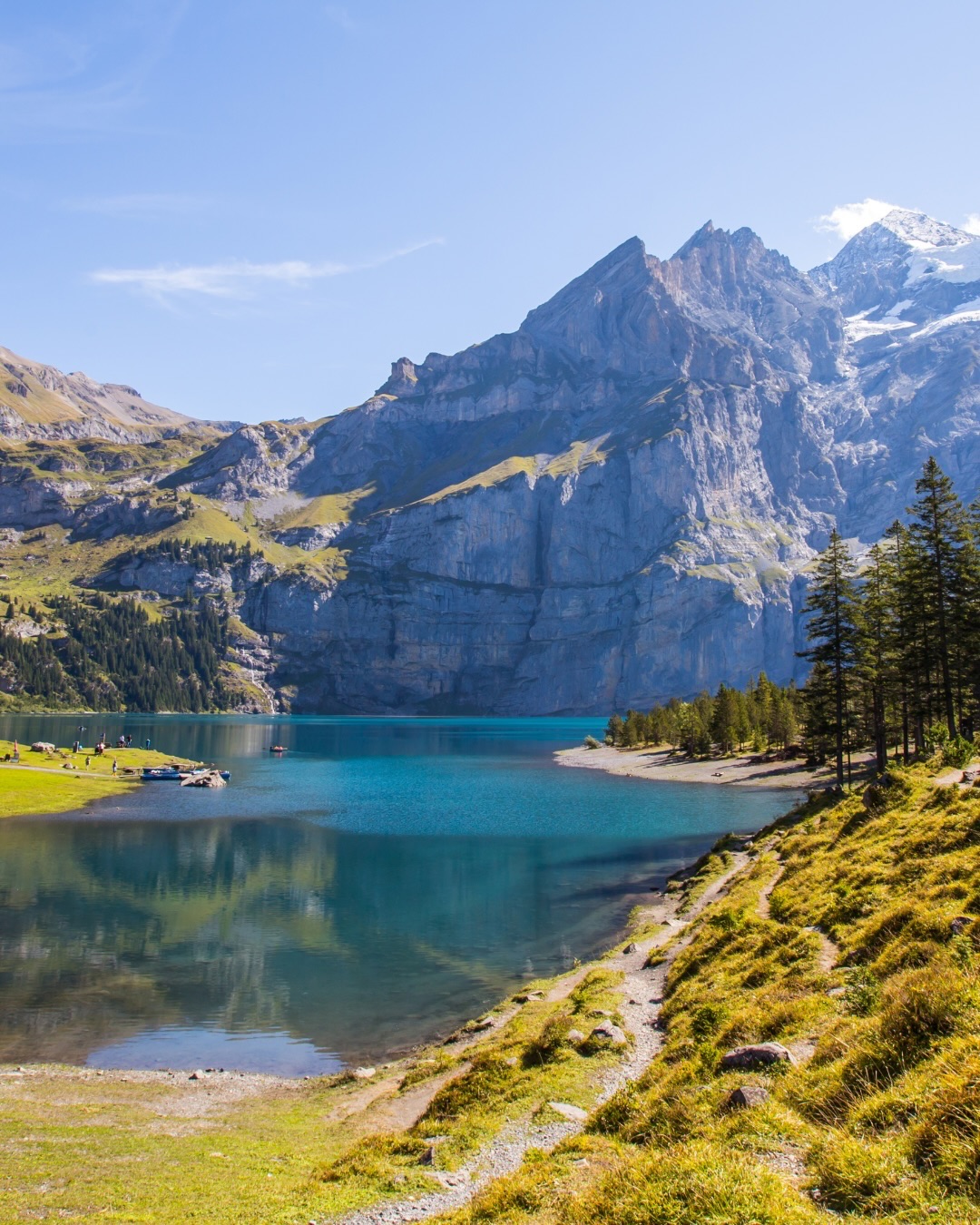 Lake Oeschinen feels like a secret even though it isn’t. When you first see it, the water looks impossibly blue, almost like it’s been edited. Surrounded by cliffs and alpine meadows, the silence here is striking, broken only by the occasional cowbell in the distance.
