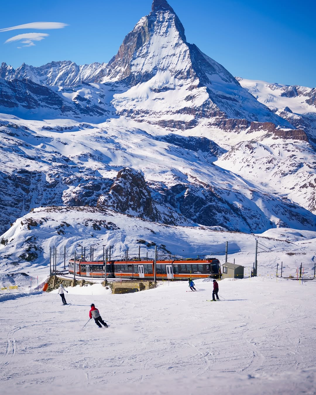 Zermatt feels like a perfectly curated alpine village, but what makes it unforgettable is the constant presence of the Matterhorn. You’ll catch glimpses of it between buildings, then suddenly it reveals itself fully, rising to 4,478 meters with a sharp, almost unreal symmetry.