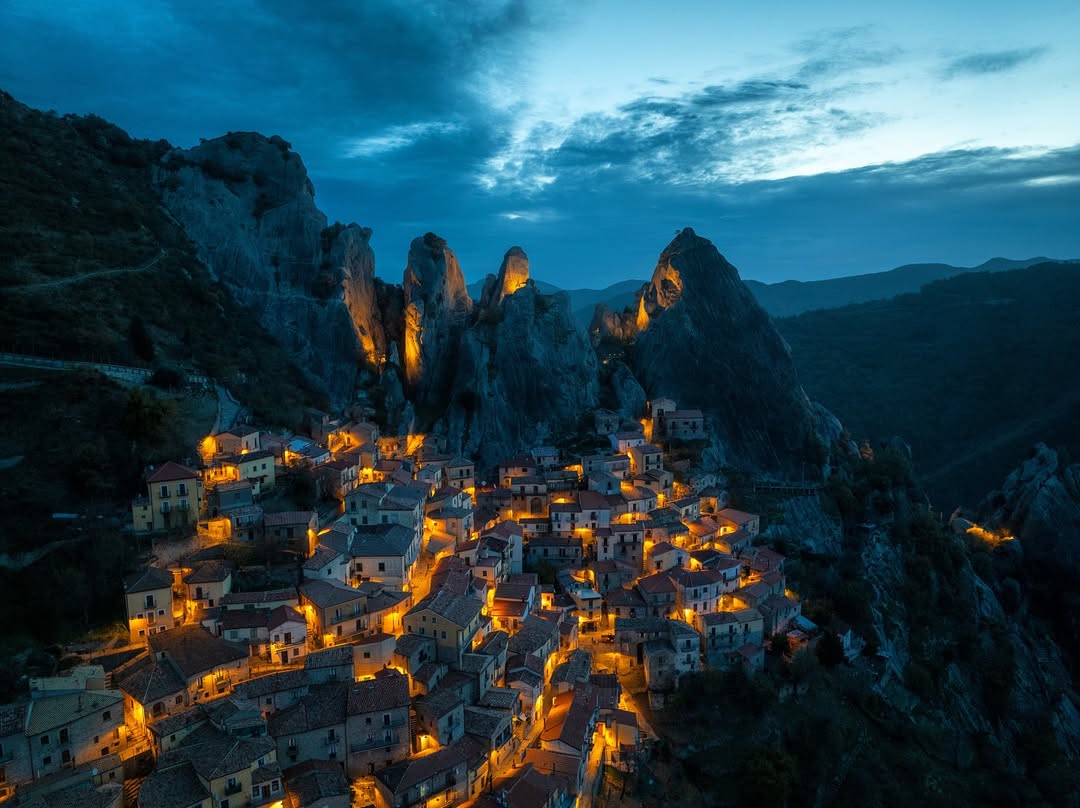 You’ll see it before you fully understand it. Jagged Dolomite-like peaks rise straight out of the earth, and somehow, a village is carved right into them. Castelmezzano feels suspended between rock and sky, with stone houses clinging to impossible slopes.
