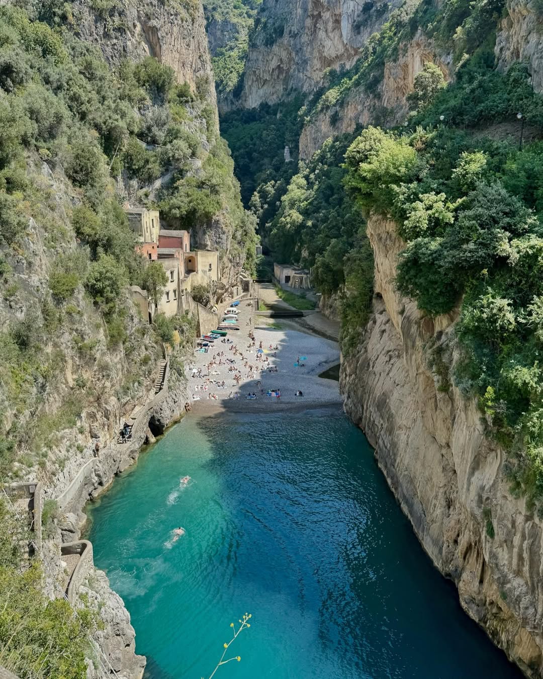 This is one of the most dramatic spots on the Amalfi Coast, yet many people miss it. A narrow fjord cuts into the cliffs, with a small hidden beach at the bottom and a bridge towering about 30 meters above.