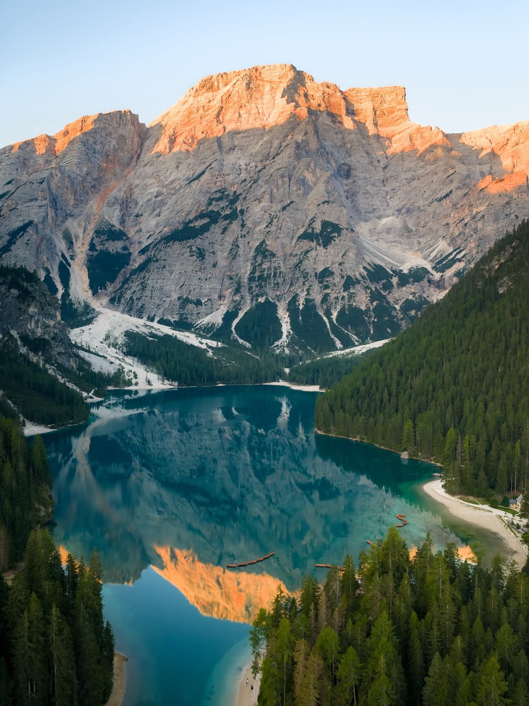 You’ve probably seen photos, but being here feels different. The water shifts between emerald and deep blue, reflecting steep Dolomite peaks that rise directly from the shoreline.