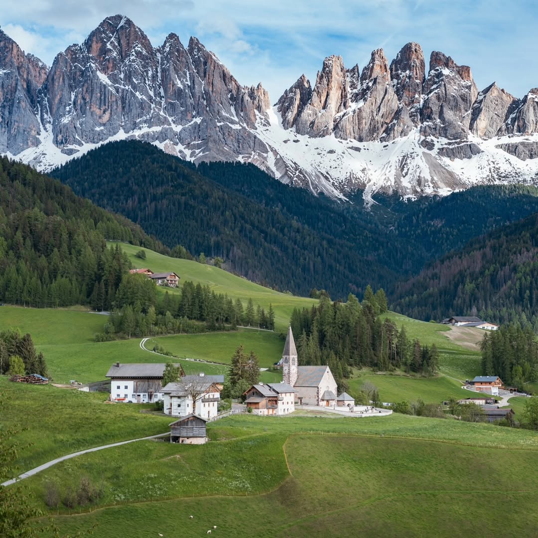 This is where the Dolomites feel almost unreal. You’ll see rolling green meadows, tiny wooden barns, and dramatic jagged peaks rising behind them. It’s quiet, almost cinematic, especially compared to busier alpine towns.