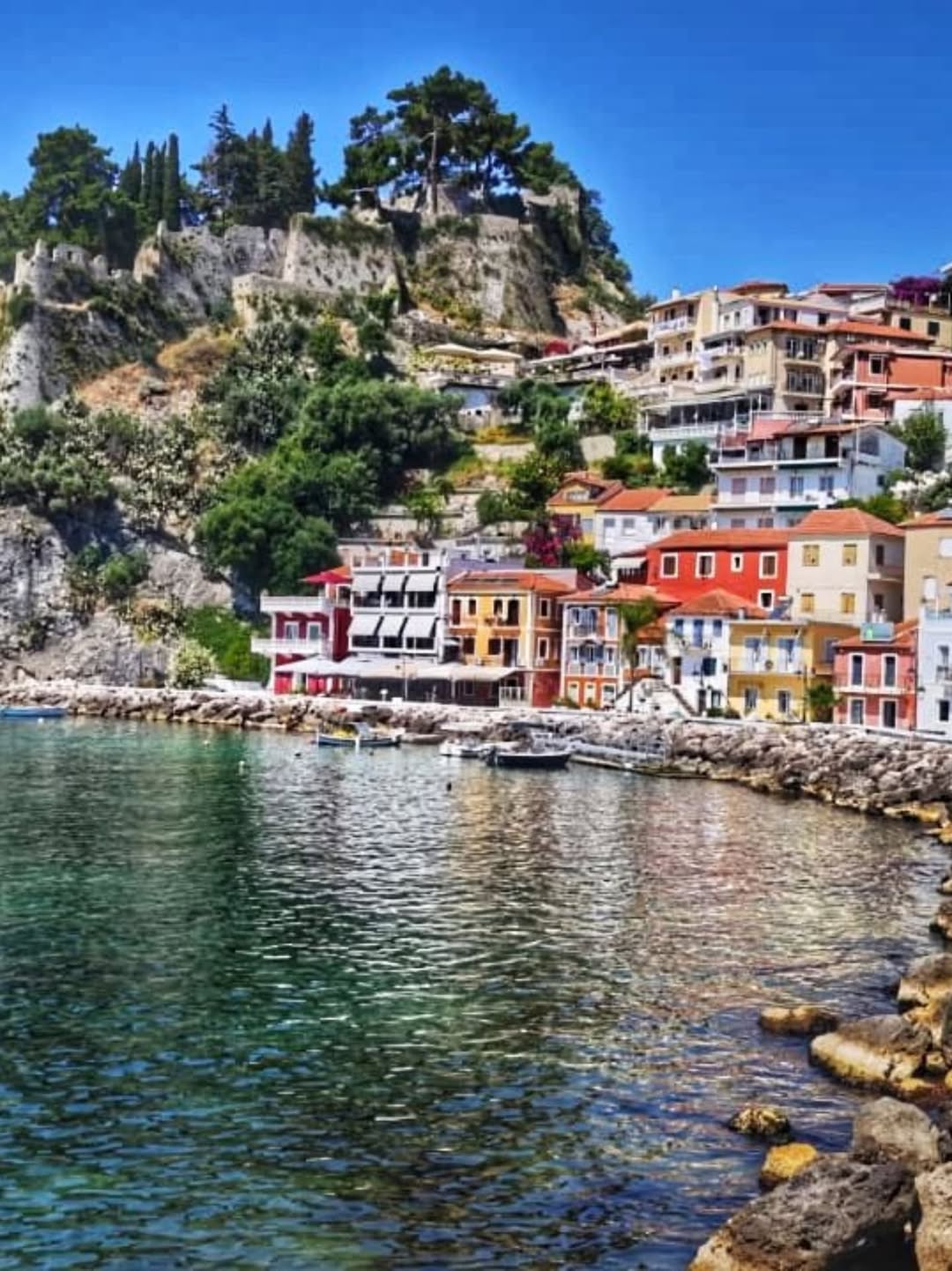Parga feels like a colorful surprise on the mainland. You’ll notice houses stacked in bright shades along the hillside, facing a calm bay that almost looks like an island setting.