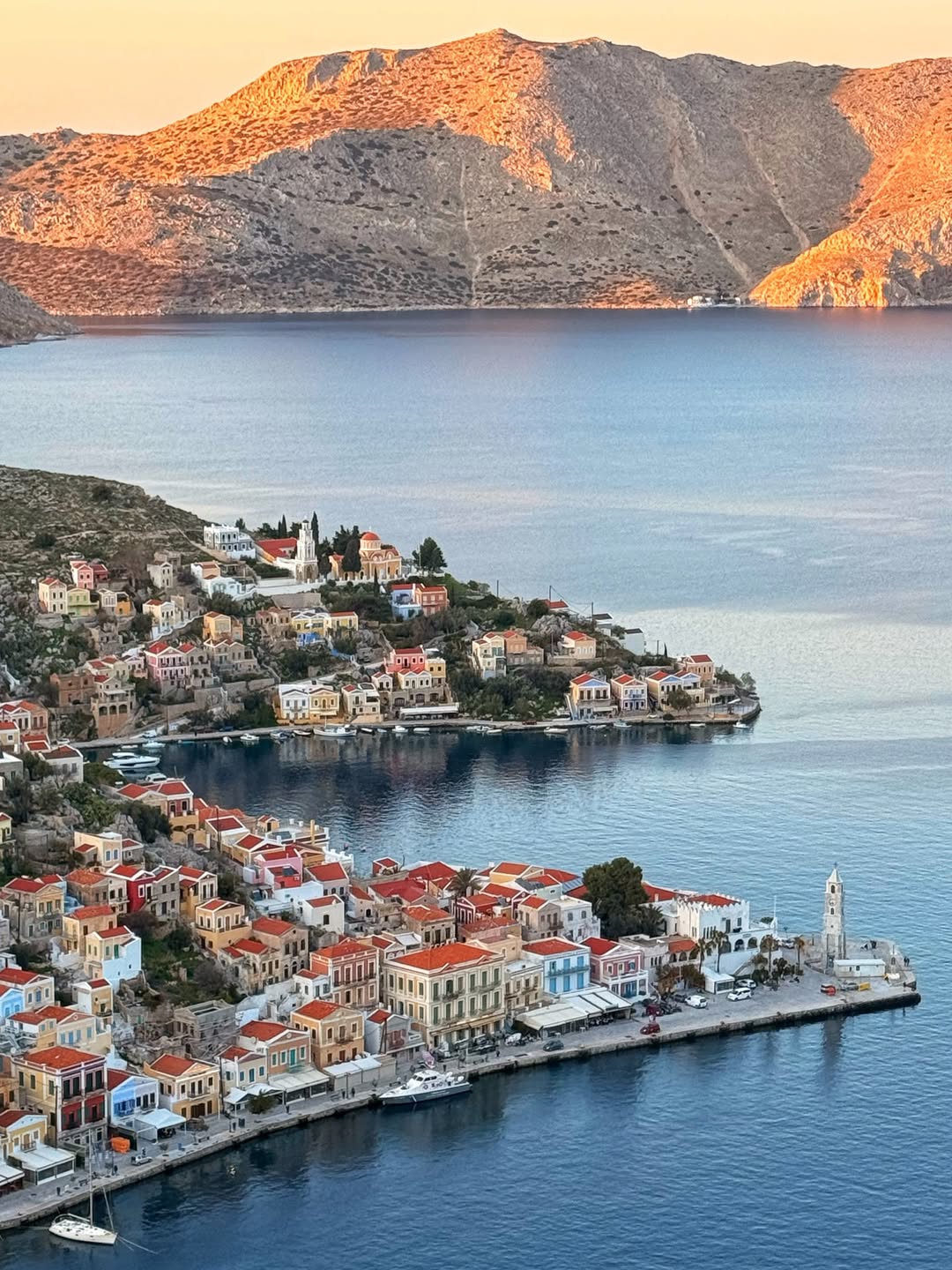 Symi makes a strong first impression. As your boat approaches, you’ll notice rows of neoclassical houses in soft pastel shades rising around the harbor. It’s one of the most visually striking arrivals in Greece.